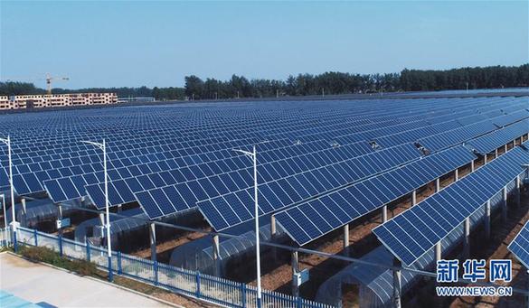 这是涟水县唐集镇的鑫源“农光互补”光伏项目发电场,场内光伏板下建有农业大棚(6月23日无人机拍摄)。近年来,江苏省涟水县积极推进“农光互补”等光伏新能源项目建设,探索“光伏+农业”发展新模式。“一地两用、阳光共享”上方光伏板发电、光伏板下兼顾农业生产,不仅提升土地综合利用率,也推动了当地清洁能源和绿色经济的发展。新华社记者李雨泽摄