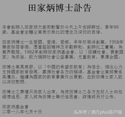《田家炳博士讣告》