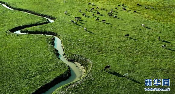 8月22日,牛群在广灵县壶流河湿地觅食(无人机拍摄)。