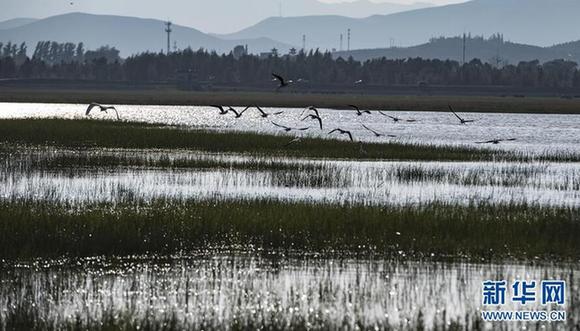 8月22日,野鸟在广灵县壶流河湿地飞翔。
