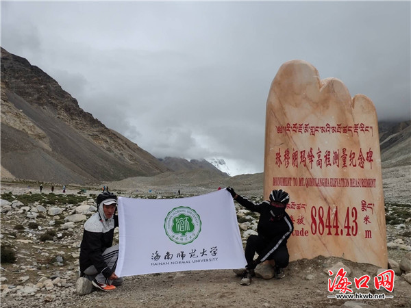8月9日下午4时许,历时24天,李国永到达最后一站——珠峰大本营。“当到达珠峰时,看着眼前的高山白云,心中有莫名的激动。”到了珠峰大本营,兴奋之余,他拿出陪伴了自己一路的“海南师范大学”校旗,和别的骑友在大风中与旗帜合影,在世界之巅留下母校的身影。