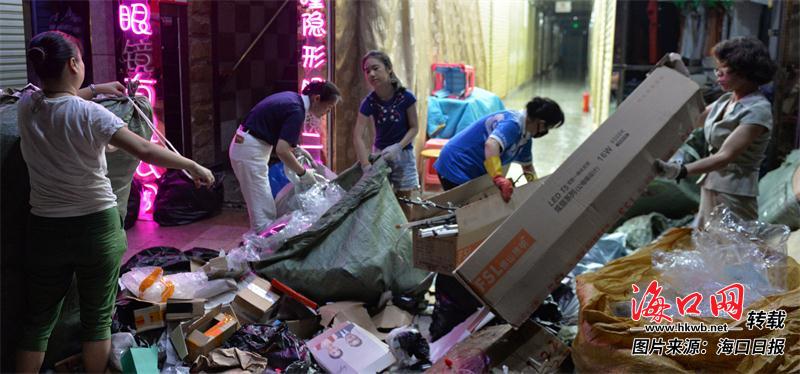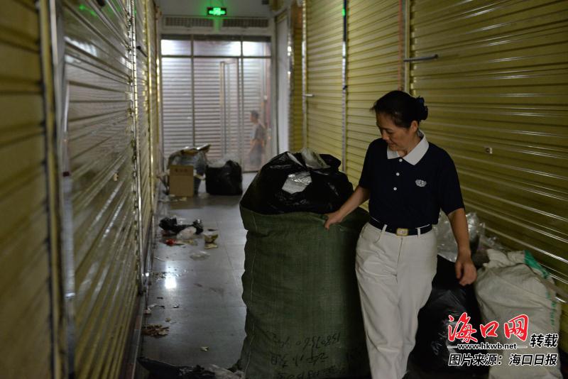 ⑥来到得胜沙步行街,程祝月将走道里的垃圾拖出来分类。