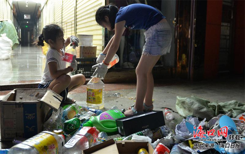 8月27日傍晚6点多,程祝月带着9岁的女儿符茗心来到得胜沙步行街,在路边停好车后,两人径直走进两排店面中间的小道,熟门熟路得像店家、像常客,不过她们是来捡垃圾的。得胜沙的垃圾分类活动一般在周六,程祝月做环保时常会带上女儿,这对孩子既是教育,她也多个帮手,刚读五年级的小女儿已是资深环保志工。她俩最先到,其他志工会稍后加入。走道里,几大麻袋的垃圾靠着墙,程祝月和女儿一起拖着麻袋走到门口,将垃圾倒出来再进行分类:透明包装袋分在一起,有色垃圾袋另放,旧纸盒扎好,饮料瓶要把瓶盖拧掉,倒空液体再收集……如今,两人对垃圾分类已十分熟练。