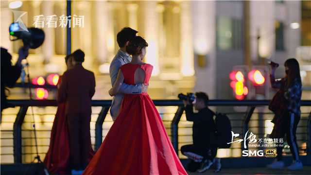 外滩亲水平台上,灯光映出喜悦的面孔;母亲记录孩子的成长,甜蜜的恋人用婚纱照定格幸福。