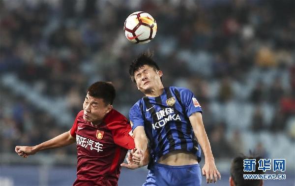 图为11月3日,江苏苏宁易购队球员周云(中)在比赛中拼抢。 新华社记者杨磊摄