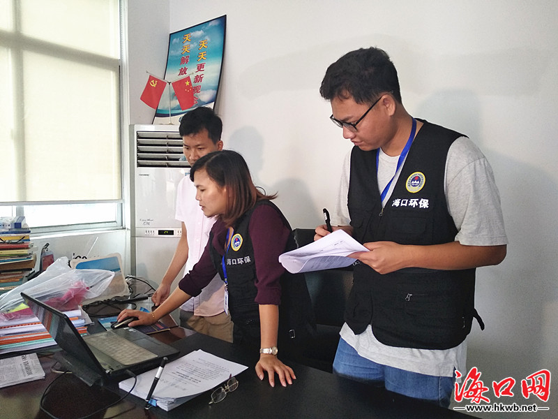 秀英区环境监察局工作人员来到齐鲁制药(海南)有限公司查看材料。记者刘杰 摄