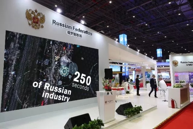 俄罗斯展区以白色为主色调,简洁明快地展示着俄罗斯的核电、旅游、体育等产业。参展展品分为5大类:食品与农产品、高技术产品、医疗设备、服务贸易项目及其他日常消费品。