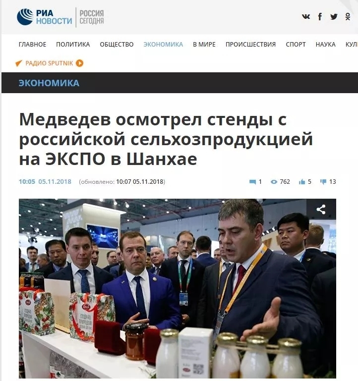 俄新社网站5日刊文:《梅德韦杰夫视察上海进博会俄罗斯农产品展区》