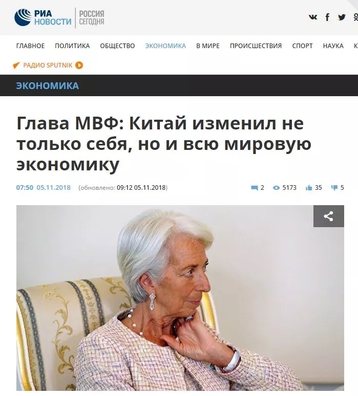 俄新社网站当天还播发一篇以《IMF总裁:中国不仅改变了自己,还改变了整个世界经济》为题的报道,援引了国际货币基金组织总裁拉加德在进博会开幕式上的致辞,为中国点赞。