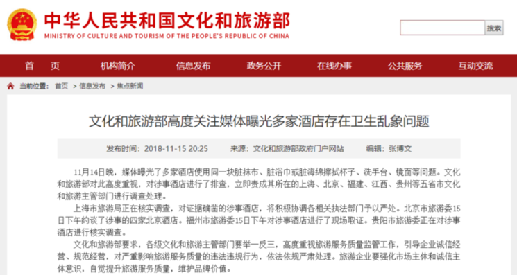 回应称,11月14日晚,媒体曝光了多家酒店使用同一块脏抹布、脏浴巾或脏海绵擦拭杯子、洗手台、镜面等问题。文化和旅游部对此高度重视,对涉事酒店进行了排查,立即责成其所在的上海、北京、福建、江西、贵州等五省市文化和旅游主管部门进行调查处理。