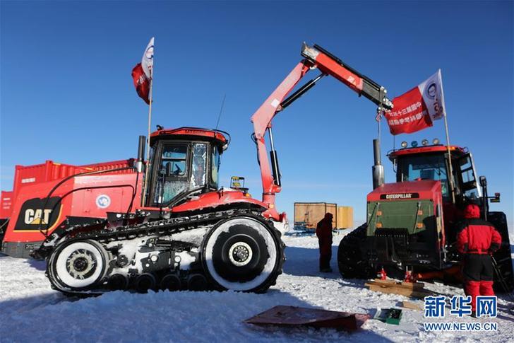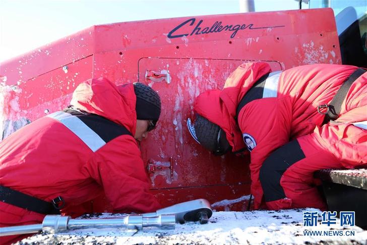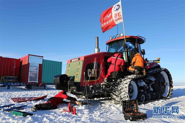12月23日“凌晨”,中国第35次南极科考队内陆队机械师在修理卡特雪地车。 (配本社同题文字稿) 新华社记者 刘诗平 摄
