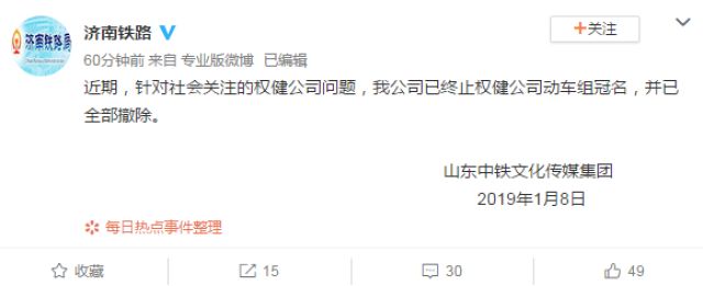 近期,针对社会关注的权健公司问题,我公司已终止权健公司动车组冠名,并已全部撤除。