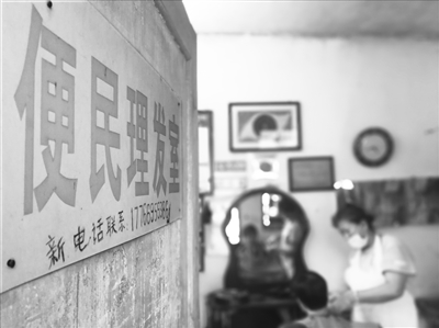 这家店设在一间原先用作保安室的小屋里,面积只有8平方米。门口陈旧木门上写着5个大字:便民理发室,还预留有一个电话号码。镜子、理发椅、桌子……店内的摆设物品虽然有些残旧,但收拾得还算比较工整干净。