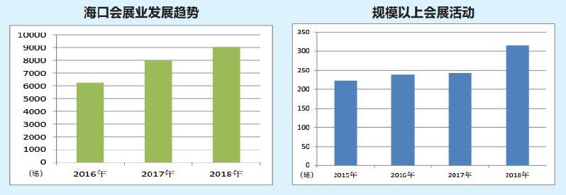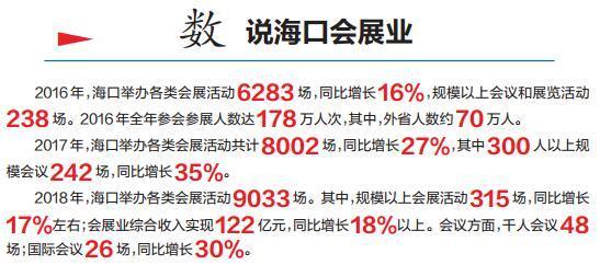 2016年,海口举办会展活动6283场;2017年,举办会展活动8002场;2018年,举办会展活动 9033场。近年来,一个个重大会展活动接踵而来,逛不完的展、数不尽的会,让海口的知名度、社会效益、经济效益等实现“丰收”,如今,椰城正朝着国际知名会议目的地和区域性会展中心的方向和蓝图加速迈进。