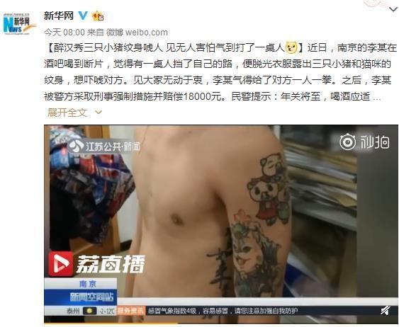 近日,南京的李某在酒吧喝到断片,觉得有一桌人挡了自己的路,便脱光衣服露出三只小猪和猫咪的纹身,想吓唬对方。见大家无动于衷,李某气得给了对方一人一拳。之后,李某被警方采取刑事强制措施并赔偿18000元。民警提示:年关将至,喝酒应适量。