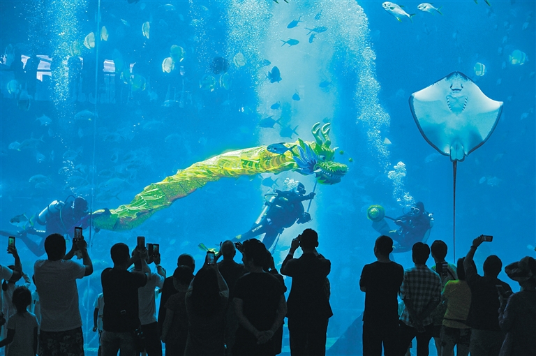 2月5日,新春大年初一,三亚·亚特兰蒂斯酒店,潜水员舞动“南海龙王”在海底世界与各种鱼儿畅游共舞,吸引游客驻足观赏。本报记者 王凯 摄