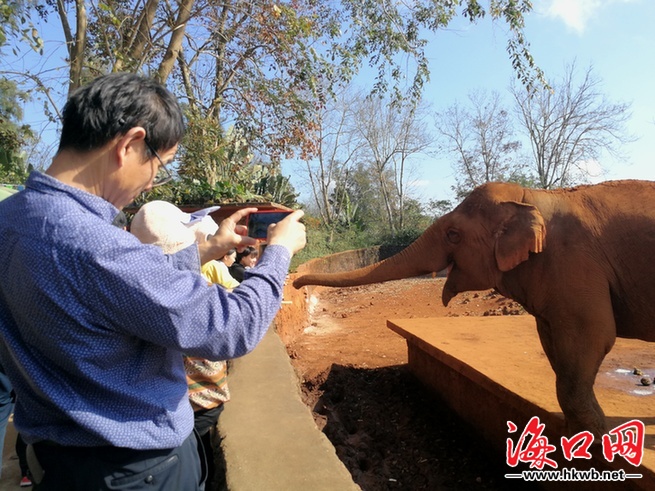 市民游客给大象拍照。