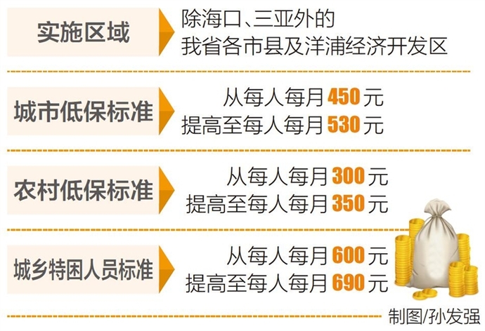 《通知》称,各市县(除海口、三亚外)和洋浦经济开发区城市最低生活保障标准从每人每月450元提高至每人每月530元;农村最低生活保障标准从每人每月300元提高至每人每月350元;城乡特困人员基本生活保障标准从每人每月600元提高至每人每月690元。所需资金从困难群众基本生活保障补助资金中支出。