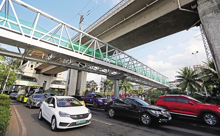 据悉,由于南海大道汽车南站前车流量大,斑马线相对较少,行人过街不便。为了便民,有关部门在此段增设了人行天桥。