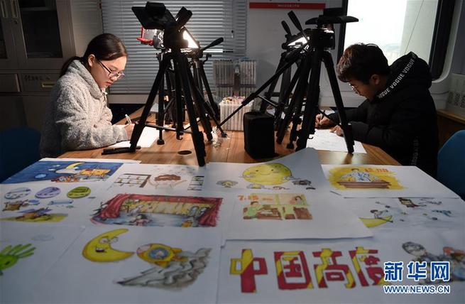 在南京航空航天大学大学生思想政治文化产品工作室,“一分钟”微视频团队的学生在绘制简笔漫画(1月11日摄)。“一分钟”系列微视频通过简笔漫画和诙谐幽默的语言在大约一分钟的时间内讲解各种时事热点、航天知识、校园政策等内容。 新华社记者 马宁 摄
