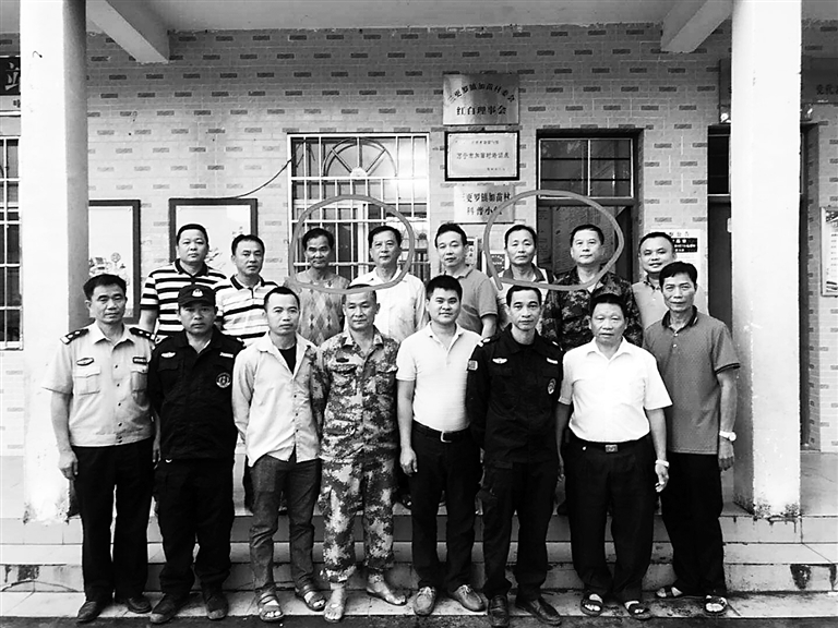 获救者(图圈中)与部分搜救人员合影。记者陈康 通讯员肖世旺 文/图