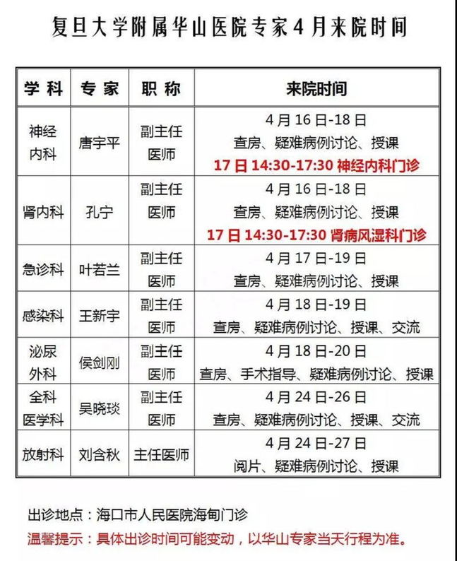海口网4月17日消息(记者钟圆圆)上海专家来琼诊疗已经形成常态化,4月,共有7位复旦大学附属华山医院的专家在海口市人民医院海甸门诊为患者服务,涉及神经内科、风湿免疫科、危重医学科等多个方向。