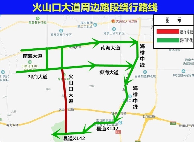 南海大道(椰海大道)—海榆中线—县道X142—石山镇周边路段