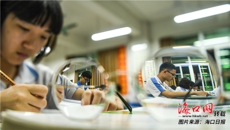 晚上九点后,海口市第一中学的高三学生依然在教室内认真学习。