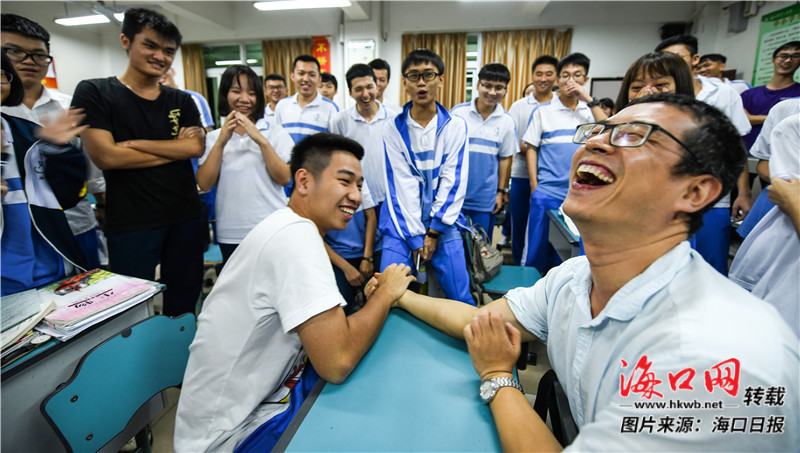 海口市第一中学高三学生和老师利用课间掰手腕,“挑战”三年来从不敢冒犯的老师。