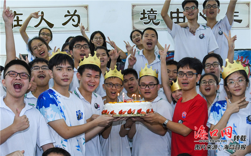 海南华侨中学高三(8)班学生在高中最后的时光为即将过生日的同学点燃蜡烛许下心愿。