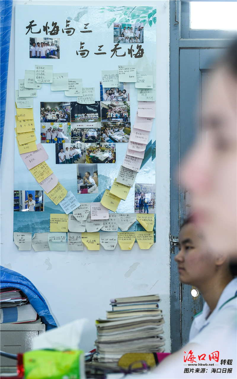 海南华侨中学高三教室的心愿墙上记录了学生三年来的生活和高考后的心愿。