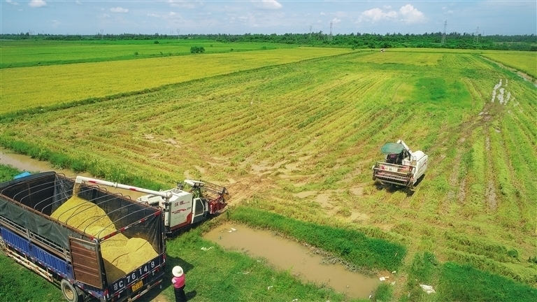 日前,位于文昌市锦山镇南拔村的水稻田,一眼望去,稻浪起伏,联合收割机穿梭于田间收割水稻。