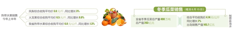 去年荔枝价低难卖让不少果农心有余悸,今年荔枝价高抢手让果农振奋不已。“今年以来,包括冬季瓜菜、热带水果、热带作物等,各类农产品都是价高好卖。”省农业农村厅相关负责人介绍,通过大力调减低产低效热带农产品结构,积极推广优质高效农作物种植,合理引导农民改种特色高效农产品,着力扶持、培育热带农业新产业、新业态发展,我省热带农业转型升级明显加快。