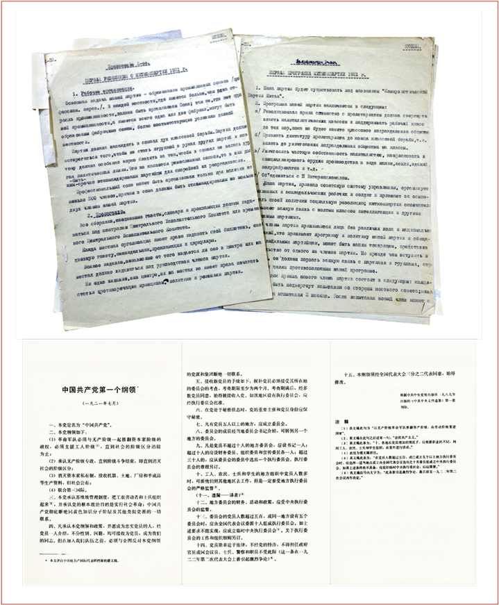 中国共产党第一次全国代表大会宣告了中国共产党正式成立。大会通过的纲领表明,中国共产党从建立开始就旗帜鲜明地把实现社会主义、共产主义作为自己的奋斗目标。由于当时没有条件把档案保存下来,这部纲领现在没有中文原本。上图为中共一大文献的俄文原件(新华社发),下图为译自俄文稿的《中国共产党第一个纲领》中文版本。