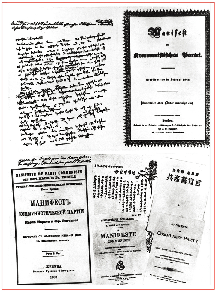 《共产党宣言》是第一次全面阐述科学社会主义原理的伟大著作,一经问世,就在实践上推动了世界社会主义发展,深刻改变了人类历史进程。图为《共产党宣言》的一页草稿(左上图)和多种文字的《共产党宣言》版本。 新华社发