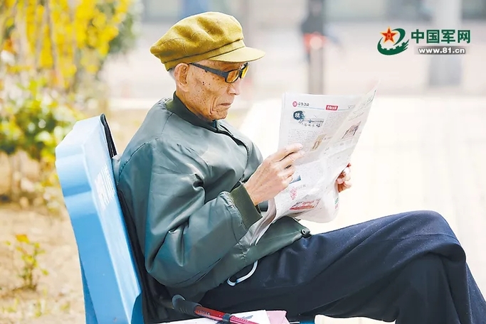周智夫在干休所小花园中阅读报纸。姜东军 摄