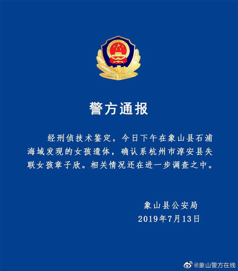 据浙江宁波象山县公安局官方微博消息,经刑侦技术鉴定,13日下午在象山县石浦海域发现的女孩遗体,确认系杭州市淳安县失联女孩章子欣。相关情况还在进一步调查之中。