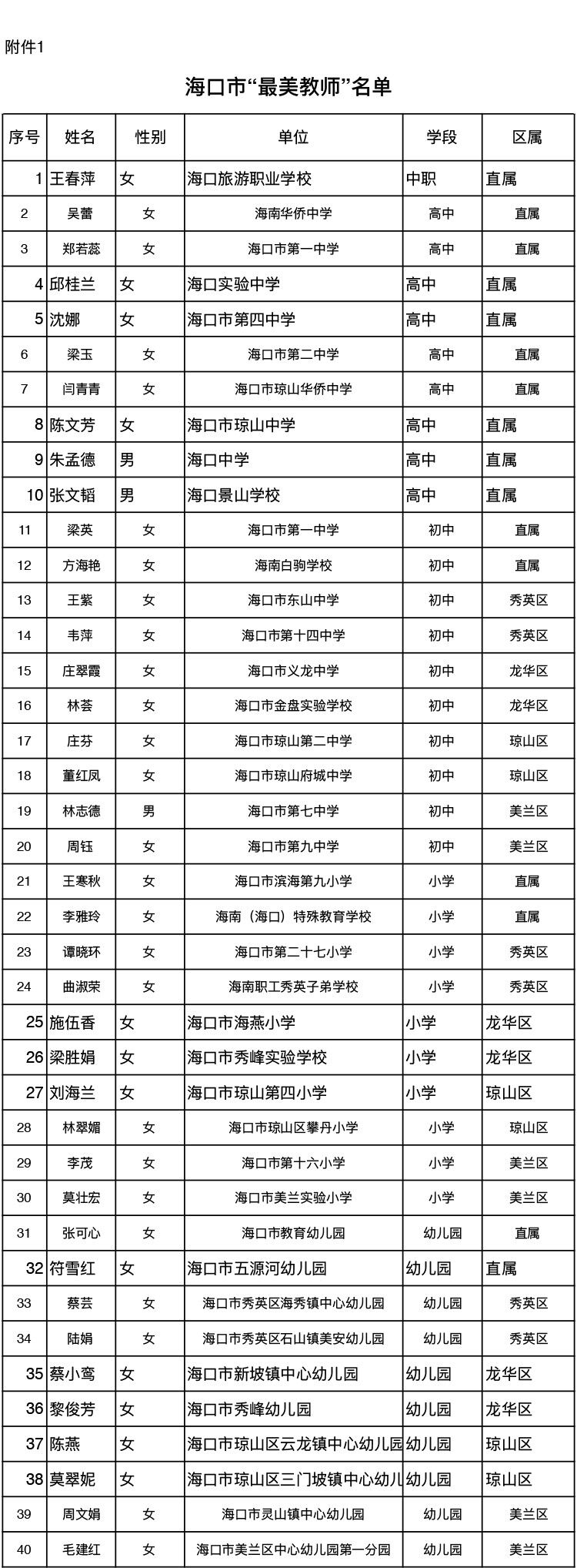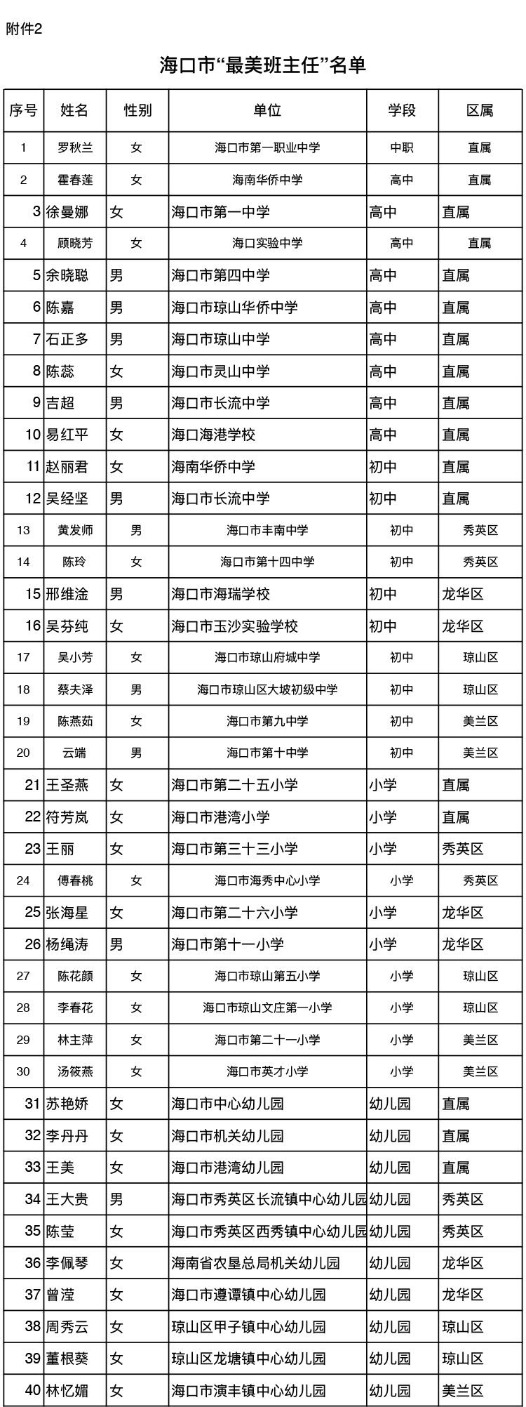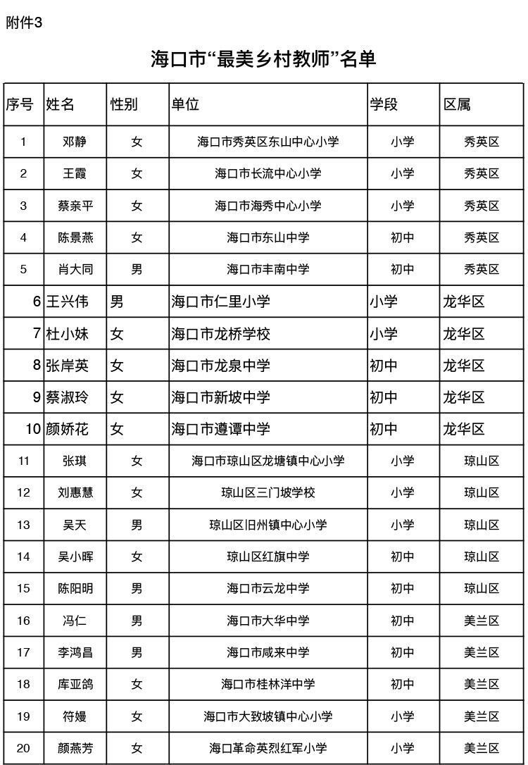 经直属、区属学校推荐,主管教育行政部门审核、公示,决定授予王春萍等40名教师为海口市“最美教师”、授予罗秋兰等40名教师为海口市“最美班主任”、授予邓静等20名教师为海口市“最美乡村教师”称号。