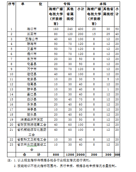 2019年海南省农民工学历与能力提升行动计划“求学圆梦行动”招生分配表