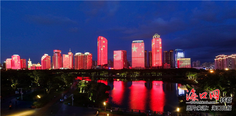 7月26日傍晚,位于海口市滨海大道的楼宇上,鲜艳的五星红旗“冉冉升起”,国旗主题灯光秀格外喜人,在美丽的夜空绽放光彩,点亮椰城。石中华 摄