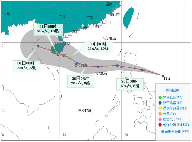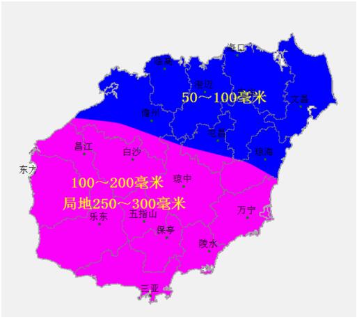 预计,8月29日20时~9月1日20时各地过程雨量:琼海、万宁、陵水、三亚、琼中、保亭、五指山、乐东、白沙、昌江和东方等市县100~200毫米,局地250~300毫米;海口、临高、儋州、澄迈、定安、屯昌和文昌等市县50~100毫米。