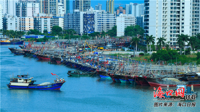 8月28日,在海口世纪大桥附近的海甸溪、龙珠湾等处,靠岸停泊的渔船连成一片。