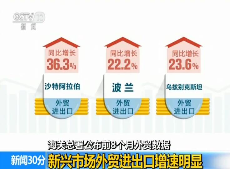 海关统计显示,今年前8个月,我国对拉丁美洲和非洲等新兴市场外贸进出口分别增长8.4%和8.8%,分别高出整体增速4.8和5.2个百分点。我国与“一带一路”沿线国家外贸同比增长9.9%,高出同期我国外贸总体增速6.3个百分点,其中与沙特阿拉伯、波兰、乌兹别克斯坦外贸进出口同比分别增长36.3%、22.2%和23.6%。