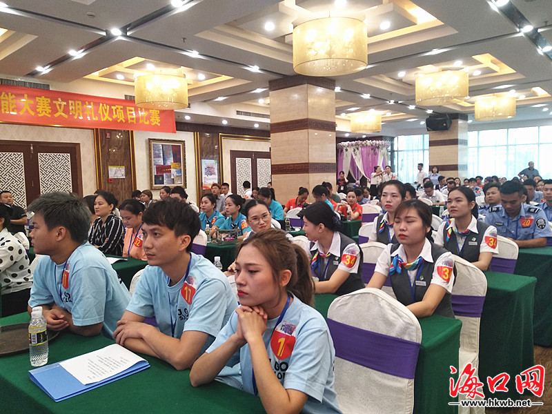 海口网9月22日消息(记者刘杰 通讯员范博 摄影报道)22日上午,由共青团海口市委员会、海口市人力资源和社会保障局、海口市旅游和文化广电体育局联合主办的“青春心向党 建功自贸区”2019海口青年服务技能大赛正式启动,共有来自全市34个行业单位的200余名职业青年参赛。