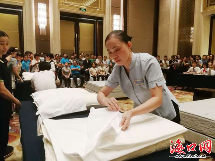 中式铺床比赛现场,只见选手抖床单、套被罩、套枕袋,各个环节一气呵成;西餐宴会摆台上的选手们有条不紊地摆放着餐具,认真核对每一个细节……据介绍,大赛共设前厅服务、中式铺床、中餐宴会摆台、西餐宴会摆台、西式调酒5个比赛项目,以及果蔬雕刻、工装礼仪展示、英语情景展示3个展示项目。