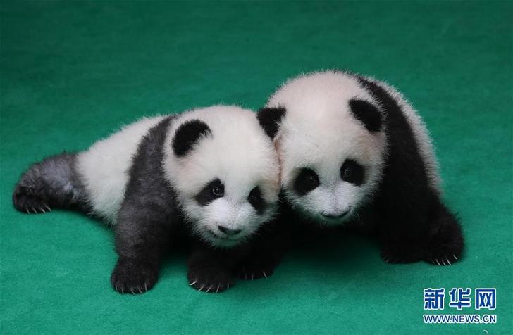 这是9月24日在成都大熊猫繁育研究基地拍摄的参与集体亮相活动的两只熊猫宝宝。 当日,成都大熊猫繁育研究基地为今年出生的7只新生大熊猫举行集体亮相活动。 新华社记者 江宏景 摄