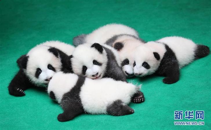 这是9月24日在成都大熊猫繁育研究基地拍摄的参与集体亮相活动的五只熊猫宝宝。 当日,成都大熊猫繁育研究基地为今年出生的7只新生大熊猫举行集体亮相活动。 新华社记者 江宏景 摄