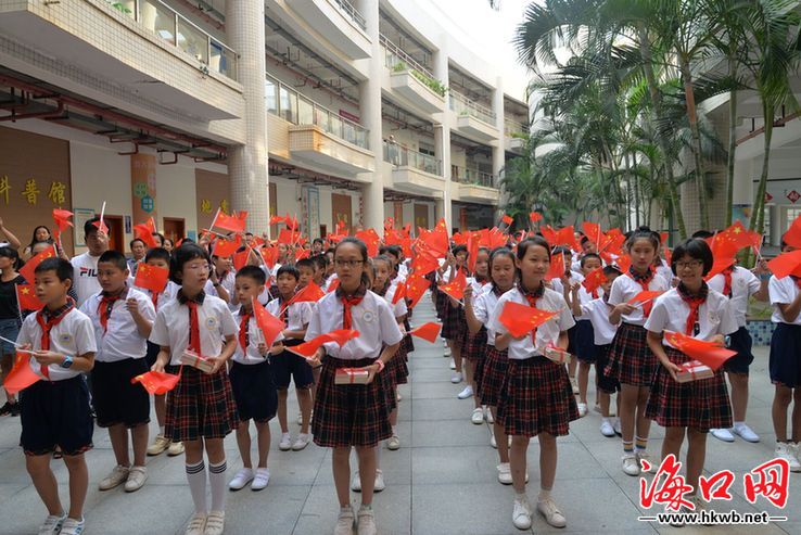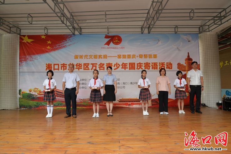 海口网9月29日消息(记者李万内 特约记者刘伟 通讯员冼欣欣)“五星红旗迎风飘扬,胜利歌声多么嘹亮……”29日早上,海南(海口)青少年活动中心内传出一阵阵《歌唱祖国》的嘹亮歌声。当天,龙华区在此举办“喜迎国庆·寄语祖国”万名青少年国庆寄语公益活动启动仪式。