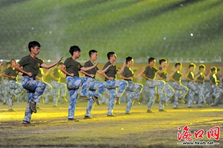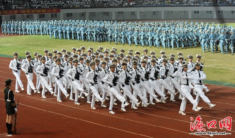 海口经济学院2019级新生军训方队进行分列式表演。见习记者王程龙 摄
