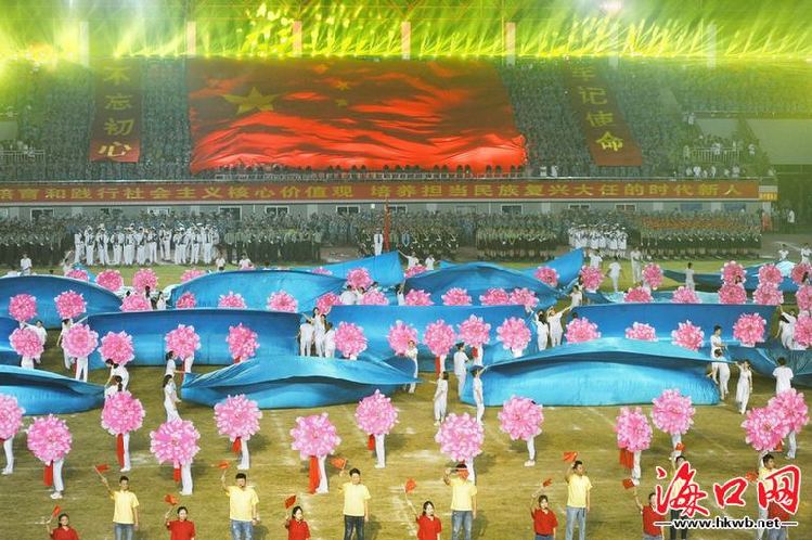 海口网9月30日消息(见习记者王程龙 摄影报道)椰风海韵迎新生,不忘初心庆国庆。9月29日,在新中国成立70周年来临之际,海口经济学院在该校田径运动场隆重举行“万人高唱颂祖国”主题活动暨2019级新生开学典礼。